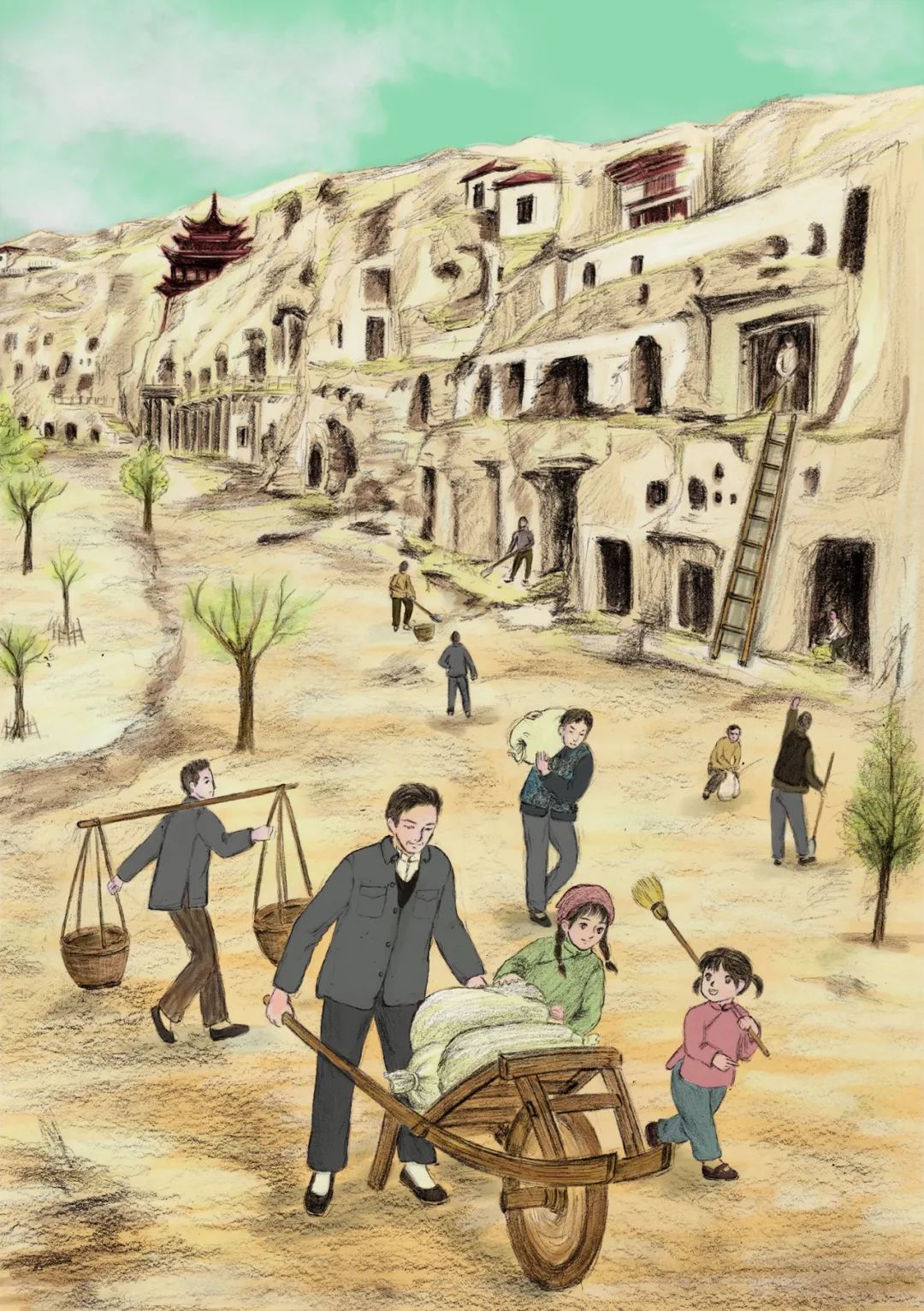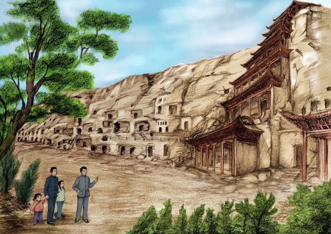 《敦煌小畫(huà)師》的故事,以民國(guó)時(shí)候國(guó)立敦煌研究所初創(chuàng)時(shí)期為背景,以一個(gè)小女孩欣潔的眼光,摹刻了一群以敦煌為文化藝術(shù)圣地而奮斗而獻(xiàn)身的藝術(shù)家和學(xué)者群體,這個(gè)群體以欣潔的父親為代表,他們舍棄溫暖濕潤(rùn)的家鄉(xiāng),而遠(yuǎn)赴那個(gè)遙遠(yuǎn)荒涼的所在。因?yàn)槟抢镉卸鼗?,因?yàn)槟抢锉4嬷磺Ф嗄昵暗恼滟F文物和彩塑壁畫(huà),還因?yàn)槟抢锛毙栌腥藖?lái)保護(hù)、修復(fù)和弘揚(yáng)。他們來(lái)了,他們?cè)谶@片戈壁之地安家扎根,在動(dòng)蕩的社會(huì)時(shí)局下開(kāi)始了為家為國(guó)的擔(dān)當(dāng),也開(kāi)始了人生理想和價(jià)值的實(shí)現(xiàn)。這一切,以一個(gè)孩子的眼光來(lái)看,幾乎就是交織著欣喜和失望、歡喜與憂愁,從茫然無(wú)知到誠(chéng)摯熱愛(ài)的一段生動(dòng)故事?!抖鼗托‘?huà)師》故事情節(jié)的設(shè)定,有起伏有高潮,有親情之愛(ài),有田野之趣,更有人與人之間和諧相助的人性之美,讀起來(lái)有聽(tīng)一首鄉(xiāng)村音樂(lè)的韻律感。我覺(jué)得,一部?jī)?yōu)秀的兒童文學(xué)作品,應(yīng)該就是這個(gè)樣子。