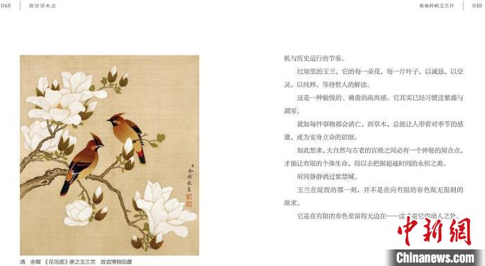 步入春天的紫禁城,文華殿書畫館前,海棠下既有扛著長槍短炮的攝影者,又有身著漢服仿佛穿越而來的妙齡女子,動靜之間,時空交錯,新的故事在生長……跟隨此書,在春日的芳菲中、在古老的書畫器用中,感受草木的繾綣,與生機勃勃的自然共赴一場故宮之約。