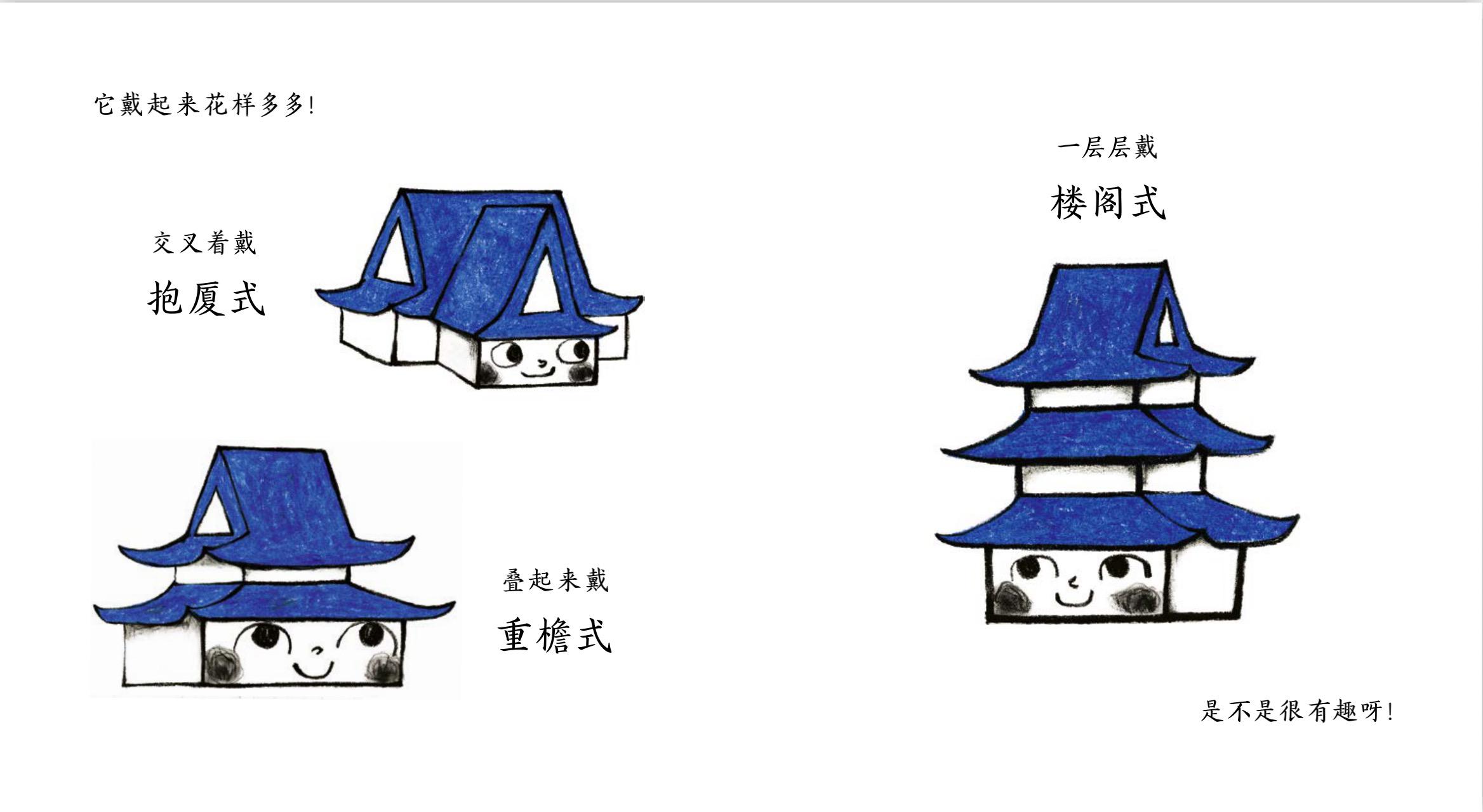 作者以真實的傳統(tǒng)建筑為原型,選取屋頂、鴟吻、窗欞、斗拱、瓦當(dāng)和柱礎(chǔ)這六個頗有代表性的傳統(tǒng)建筑構(gòu)件,讓他們自由地演繹自己的故事。比如,介紹屋頂時,想象成“給房子戴帽子”,不同的“帽子”有不同的名字,還有不同的戴法: