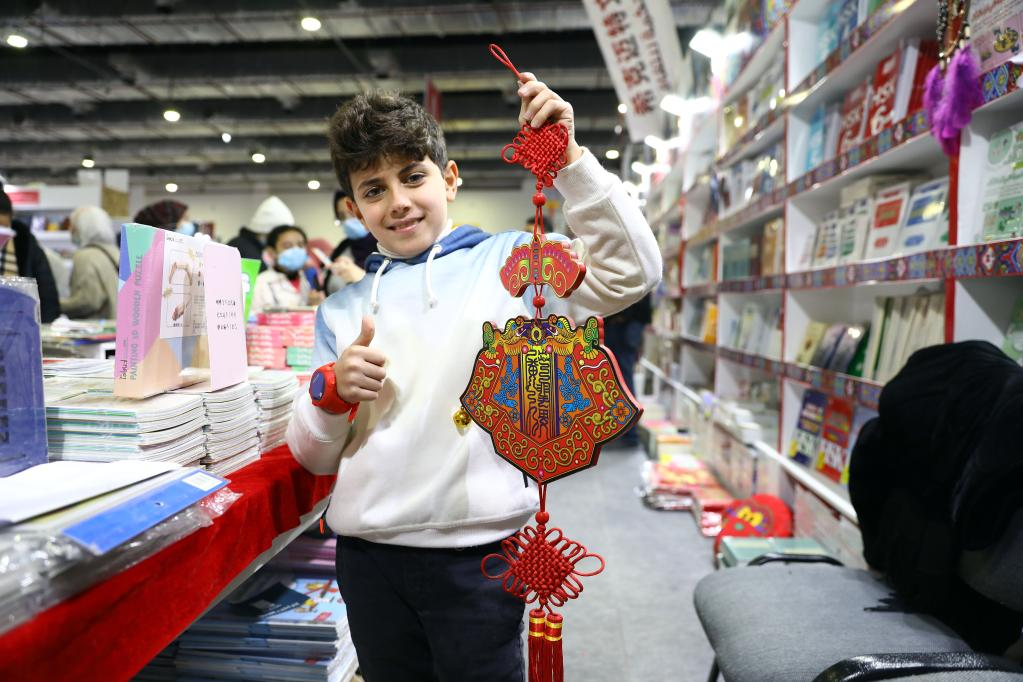 2月4日,在埃及開(kāi)羅舉辦的開(kāi)羅國(guó)際書(shū)展上,一名男孩在中國(guó)圖書(shū)展位展示春節(jié)裝飾。新華社發(fā)(艾哈邁德·戈馬攝)