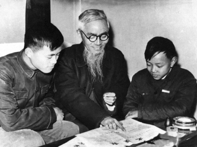 1955年,宋菲君(右)與外公豐子愷(中)一起讀報(bào)。