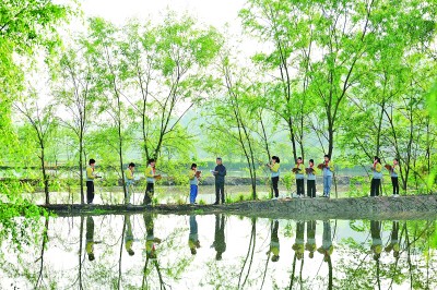 在江西萬(wàn)載縣馬步鄉(xiāng)洞口村,老師和學(xué)生們?cè)诹鴺湎麻喿x。鄧龍華攝/光明圖片