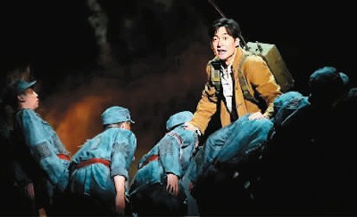 例如表現(xiàn)李安本在第三團(tuán)無線電培訓(xùn)班當(dāng)教員的場(chǎng)面時(shí),設(shè)計(jì)了兩支竹竿來表現(xiàn)擔(dān)架,模擬了人物坐在滑竿上被抬上山的感覺,也表現(xiàn)了三團(tuán)官兵學(xué)習(xí)無線電發(fā)報(bào)的場(chǎng)景。這種源自于民間戲曲中的元素,在歡快詼諧的音樂中,將老百姓生命力的可愛和戰(zhàn)士們生命力的鮮活躍然呈現(xiàn)于舞臺(tái)之上,作品的天地一下就寬大了。角色設(shè)置上也向傳統(tǒng)戲曲做了借鑒,杜南海又悶又有力量,是典型的文戲角色,而大刀、大牛、二牛這些角色都是用武戲的方式。這些都是基于傳統(tǒng)的創(chuàng)新和延展。