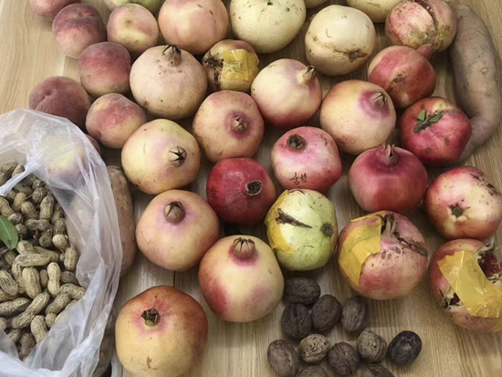 2019年10月10日收到一箱果品,一張字條寫著:“甜石榴21個,酸石榴5個(石榴皮上有膠帶和‘酸’字),甜梨5個,美人紅桃子,地瓜2塊,花生,核桃(不好看,請品嘗)。”