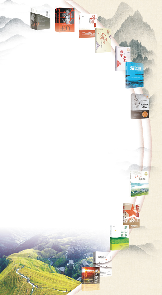 書影圖片從上至下依次為《人世間》《主角》《海邊春秋》《十八洞村的十八個故事》《國家溫度》《琵琶圍》《遠去的白馬》《江山如此多嬌》《靠山》《新山鄉(xiāng)巨變》《西海固筆記》《重卡雄風(fēng)》(按出版時間排序)。何向陽 供圖;底圖為廣西龍勝各族自治縣龍脊梯田景色。韋吉陽 攝(人民視覺)