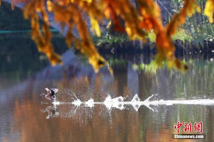 資料圖:南京燕雀湖景致。燕雀湖位于南京紫金山梅花谷南側,種植大量落羽杉、池杉、水杉等色葉樹種,每到初冬時節(jié),湖畔風景如畫。 中新社記者 泱波 攝