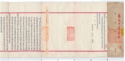 來自鎮(zhèn)江市圖書館的《封贈(zèng)文藻父母誥命》是清廷頒給張家口左翼正白旗滿洲四品銜驍騎校文藻父母的誥命,內(nèi)容為封賜文藻之父賡吉圖為昭武都尉,其母額哲特氏為恭人。這幅圣旨由黃、赤、紫三色錦織就,卷頭和卷尾分別織有漢、滿文“奉天誥命”4字,字兩旁有升龍和降龍盤繞紋樣。此誥命的制誥時(shí)間為光緒三十四年(1908年)十一月初九,當(dāng)時(shí)光緒帝已經(jīng)去世,宣統(tǒng)帝于此日即位。