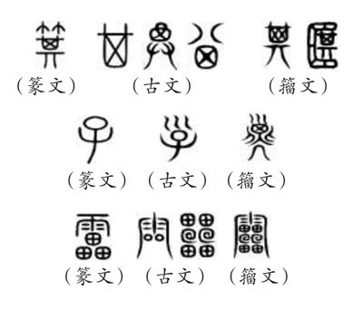 ?。ㄎ澹┧^“9353”,指的是《說文》所收全部正篆,即《說文》分析解釋的全部字?!墩f文》收字以篆文為“正”,作為標準字體,這就是許慎所說的“今敘篆文,合以古籀”的收字原則。“今敘篆文”,就是以篆文(小篆)作為標準正字,同時也會根據(jù)需要收列部分古文和籀文?!墩f文》所謂“古文”主要是孔子壁中書和民間所獻古文經(jīng)所用的文字,“籀文”即傳為西周晚期太史籀所編字書《史籀篇》上的文字。從《說文》來看,收入的古文、籀文,主要是與篆文有明顯差異的字形。如篆文“箕”“子”“雷”下所收列的古文、籀文: