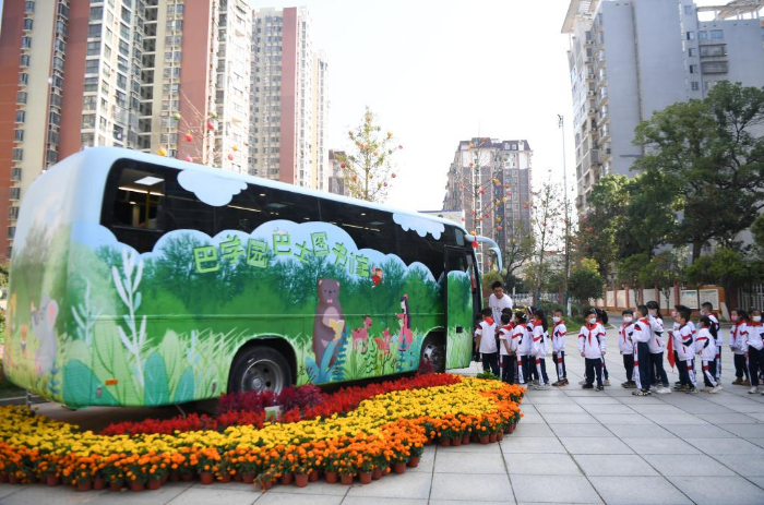 11月10日,長沙市青園友誼小學(xué)的學(xué)生排隊進(jìn)入巴士圖書館。