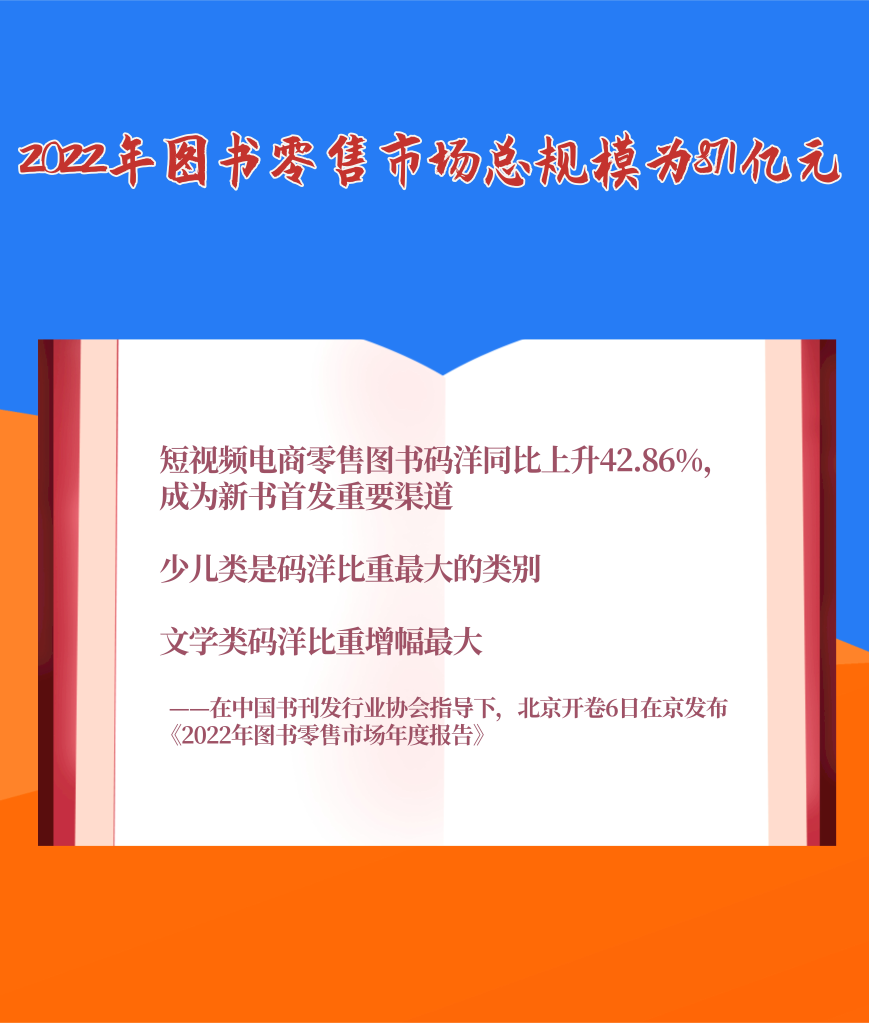 1月6日,在中國書刊發(fā)行業(yè)協(xié)會指導(dǎo)下,北京開卷信息技術(shù)有限公司在京發(fā)布《2022年圖書零售市場年度報告》。報告顯示,2022年我國圖書零售市場碼洋規(guī)模為871億元。短視頻電商零售圖書碼洋同比上升42.86%,碼洋占比趕超實體書店,成為新書首發(fā)重要渠道。