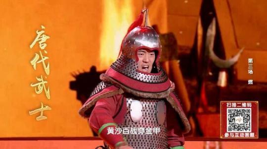 “王于興師,修我甲兵,與子偕行”是統(tǒng)一六國(guó)的秦代武士;“戎馬鳴兮金鼓震,壯士激兮忘身命”是平定邊患的漢代武士;“黃沙百戰(zhàn)穿金甲,不破樓蘭終不還”是萬(wàn)里長(zhǎng)征的唐代武士;“壯志饑餐胡虜肉,笑談渴飲匈奴血”是直搗黃龍的宋代武士。這幾位武士代表堪稱(chēng)《中國(guó)詩(shī)詞大會(huì)》“史上最強(qiáng)出題天團(tuán)”,為選手們帶來(lái)超燃的題目。
