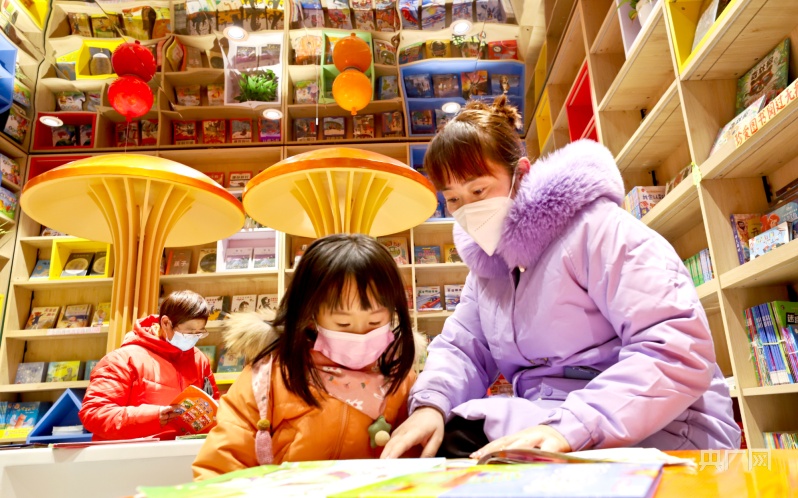 1月23日,一位母親帶著孩子在甘肅張掖錦華書城讀書。(央廣網(wǎng)發(fā) 王將 攝)