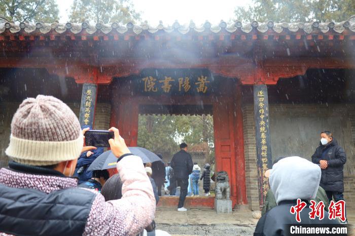 中新網(wǎng)鄭州2月23日電 (王迪)春雪依依,古柏森森,紅墻青瓦間傳出幾句儒家經(jīng)典的吟誦之聲……在22日的“寫意中國——探訪漢字起源”主題宣傳采訪中,記者探訪了河南登封市區(qū)北約二公里處嵩山南麓的嵩陽書院。是日清晨,登封忽降細(xì)雪,映襯得整個嵩陽書院愈發(fā)肅穆。美景難得,引得游人紛紛駐足欣賞,拍照留念。