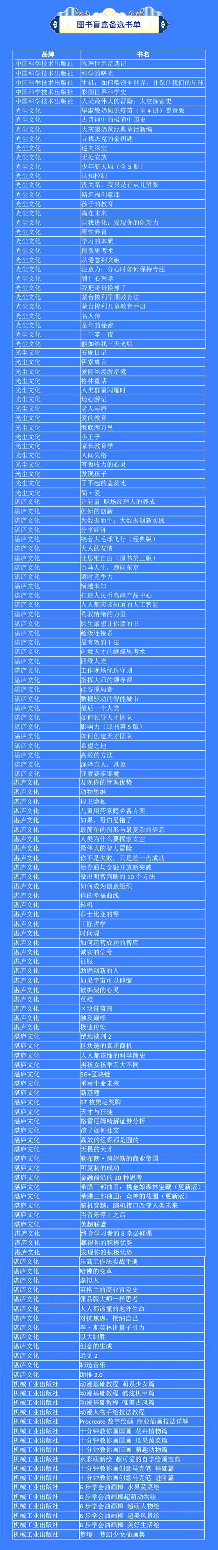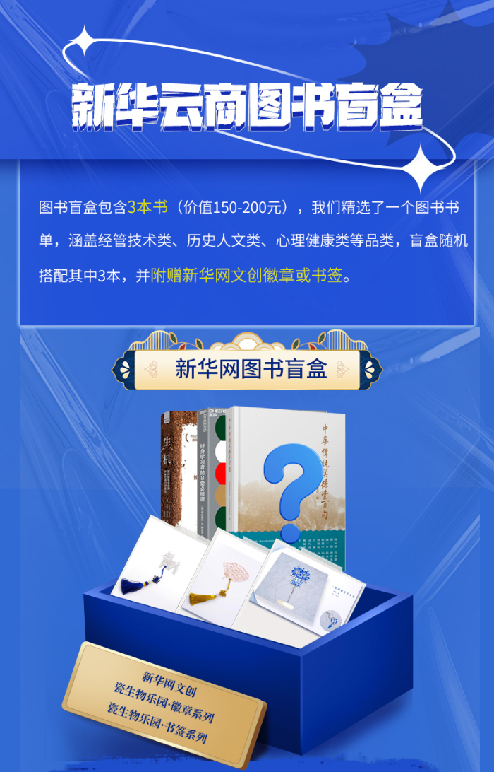 本次活動(dòng)由新華云商聯(lián)合機(jī)械工業(yè)出版社、中國科學(xué)技術(shù)出版社、光塵文化、湛廬文化共同推出。盲盒內(nèi)圖書涵蓋經(jīng)管技術(shù)類、歷史人文類、心理健康類等品類,將隨機(jī)搭配三本,可能與您的藏書重復(fù),或不符合您的閱讀愛好,請您慎重選擇理性購買。同時(shí),盲盒內(nèi)會(huì)附贈(zèng)新華網(wǎng)文創(chuàng)徽章或書簽。