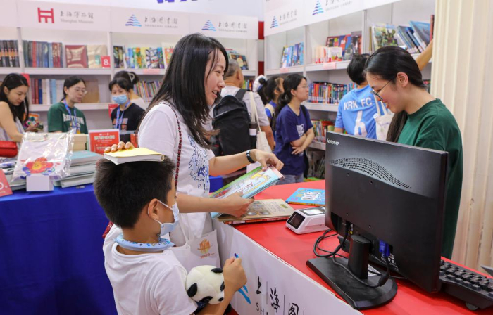 8月16日,讀者在上海圖書(shū)館展位現(xiàn)場(chǎng)借閱書(shū)籍。