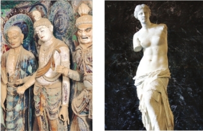 可是,“脅侍菩薩微笑著,在她低垂的眼中可能根本沒(méi)有勝負(fù)這回事。這種眼神是利他而非個(gè)人的……當(dāng)我們?cè)?5窟佛龕前微微俯下身子之時(shí),溫暖的奇跡出現(xiàn)了,她正慈祥地看著你。一位是由堅(jiān)硬的大理石所雕,另一位是由敦煌本地黏土所塑,維納斯和脅侍菩薩似乎代表了兩種生活態(tài)度。假如她們?cè)诒R浮宮中相遇,談?wù)撈鹈馈>S納斯可能會(huì)唱起女詩(shī)人薩福的詩(shī)歌:‘你愛(ài)的就是美的。這容易解釋。’脅侍菩薩則依然保持微笑,靜靜地看著維納斯”。