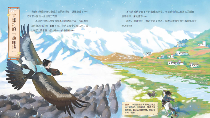 你可以游遍祖國大地的東西南北:在西北村落的屋頂上跟小伙伴賽跑,去江南的粉墻黛瓦、小橋流水間劃船,在高原上遙望如童話世界一樣的碉房。春天的南方長城、夏天的避暑山莊、秋天的黃鶴樓、冬天的八達(dá)嶺長城都盡收眼底。