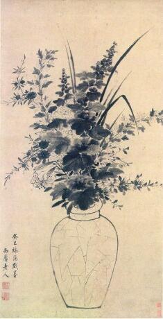 清初畫家王時敏的《端午景圖》《端陽墨花圖》,將艾草、蜀葵、柳條、石榴花等時令花草引入畫中,寄予驅(qū)邪納福的寓意。畫中所寫花草濃墨與淡墨相間,層次分明,體現(xiàn)出駕馭水墨的嫻熟技藝。值得一提的是,《端午景圖》中的瓷瓶為帶冰裂紋的豐肩斂腹瓶,這種將瓷器表面花紋如實描繪出來的現(xiàn)象,在古代花鳥畫中并不多見,由此可見畫家獨特的筆墨趣味。