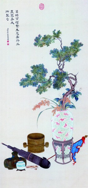 清代汪承霈繪《百福繁生圖》,柏樹、蝙蝠、幡旗和笙組合為“百福繁生”。