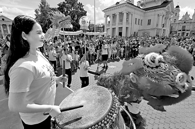 6月1日,白俄羅斯孔子學(xué)院師生在明斯克“茶和天下·雅集”活動(dòng)上表演舞龍舞獅。新華社發(fā)