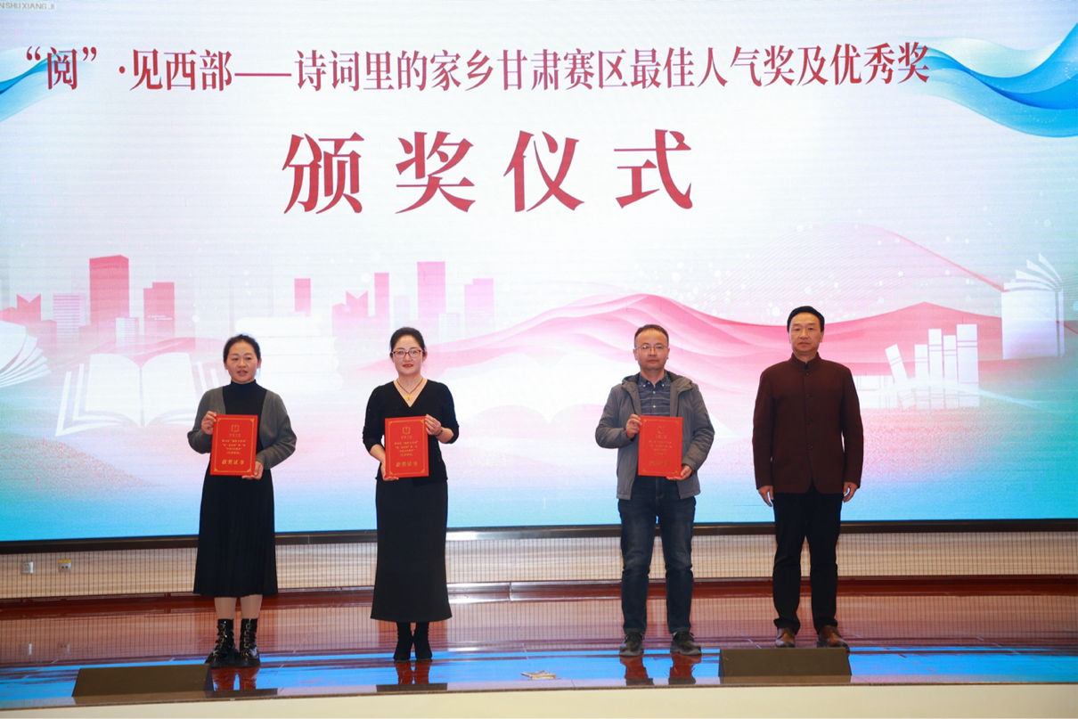 閉幕式上公布并表彰了“優(yōu)秀閱讀推廣活動(dòng)案例獎(jiǎng)”獲獎(jiǎng)人員、“‘穿越古今·夢(mèng)回隴右’詩(shī)詞大賽優(yōu)秀組織獎(jiǎng)”獲獎(jiǎng)人員、“‘閱·見(jiàn)西部’第一季——‘詩(shī)歌里的家鄉(xiāng)’(甘肅賽區(qū))最佳人氣獎(jiǎng)和優(yōu)秀獎(jiǎng)”獲獎(jiǎng)人員。