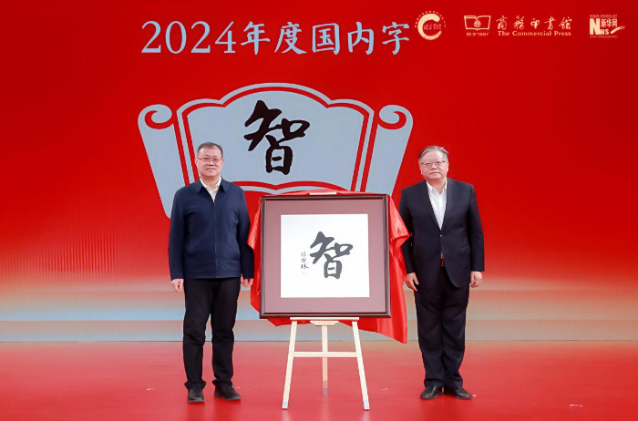 新華網(wǎng)黨委常委、總編輯車玉明(左),商務(wù)印書(shū)館黨委書(shū)記、執(zhí)行董事顧青(右)揭曉年度國(guó)內(nèi)字“智”。新華網(wǎng) 發(fā)