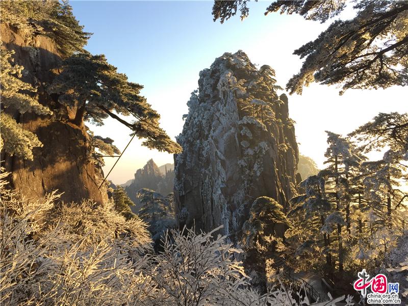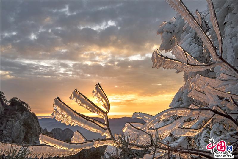 2019年最后一天黃山風(fēng)景區(qū),出現(xiàn)壯觀的日出、霧凇、云海景觀,到處銀妝素裹,冰雕玉砌,“一夜寒風(fēng)起,萬樹銀花開”,置身其間,仿佛進入撲朔迷離的童話世界,給來山的游客帶來意外的驚喜。