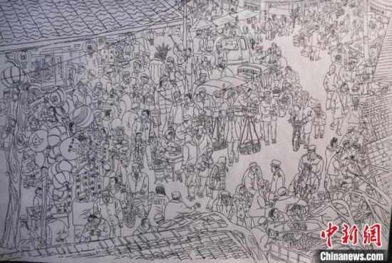 蘭州鋼筆畫愛好者周新平勾勒了數(shù)組關(guān)于鄉(xiāng)村記憶的鋼筆畫,其中,《隴西臘月圖》是他歷時三個多月,手繪了200多村民,完成的一幅舊時農(nóng)民過年趕集的熱鬧圖景:賣糖葫蘆的小販、剪紙賀春的手藝人、趕車挑擔(dān)的趕集人……周新平說,他很怕“集市文化”將來被人們遺忘,用鋼筆記錄下來,留住記憶里的“年味”以感悟鄉(xiāng)愁。