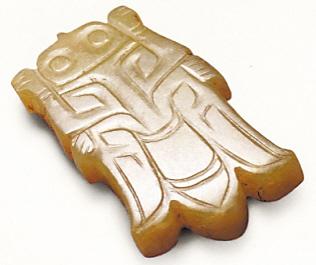1987年,文物工作者從金塔縣金塔鄉(xiāng)五星村采集到一件琥珀雕對(duì)鳥紋佩飾,長4.5厘米,寬5.8厘米。色橙黃,表面泛白。呈連體交頸對(duì)啄的雙鳥形。鳥體扁圓,像一對(duì)合體的豆莢。雙目如珠,啄喙尖長,相接相吻。二鳥雙喙處有三角形穿孔,鳥身中下部也有一橫孔,可隨機(jī)穿系佩掛。這件佩飾形態(tài)別致,雕技巧妙,玲瓏美觀。現(xiàn)藏金塔縣博物館。