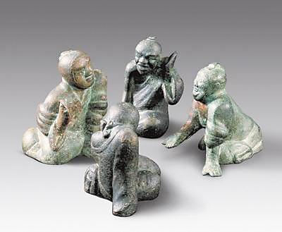 20世紀(jì)90年代甘肅靈臺(tái)縣出土了一組西漢銅質(zhì)博戲俑。俑最高9.2厘米,最寬9.7厘米。四俑相向跪坐,身著高領(lǐng)長服。其中二人頭挽發(fā)髻,二人以寬巾裹頭。坐姿不同,形態(tài)各異,有的前傾仰首,有的垂臂塌肩;有的袒胸露膊,似在伸手探??;有的屈腿斜身,默然扶膝靜坐。四俑的面部表情不同,刻畫細(xì)膩。他們或喜笑顏開,或嚴(yán)肅面對(duì),或凝神沉思,或略顯悲愁,神態(tài)活現(xiàn),精彩逼真,具有高超的藝術(shù)性和研究?jī)r(jià)值。