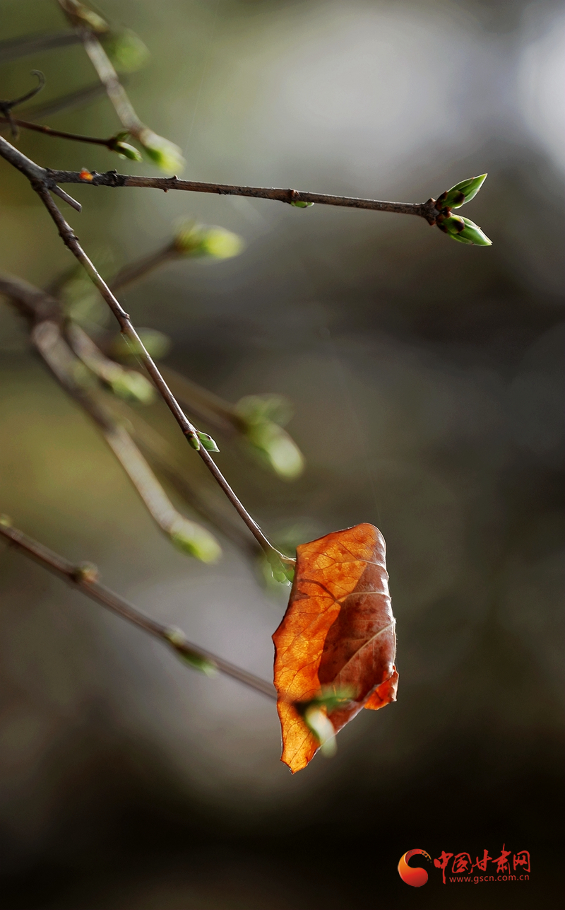 春意萌動,新綠始發(fā),一片枯葉尚未落下,新的生命已經(jīng)悄然萌發(fā)。