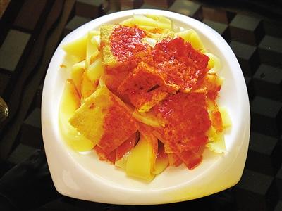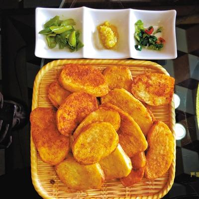 炕鍋洋芋是臨夏農(nóng)家樂里面常見的一道特色小吃,在臨夏,煎、烙之類的烹飪方式都被稱作炕,炕鍋洋芋因此得名。洋芋切片后,直接放熱油中兩面煎透??诲佈笥蟮淖龇m不復(fù)雜,但其對于火候的要求卻極其嚴(yán)苛,多一分會焦,少一分則不熟。