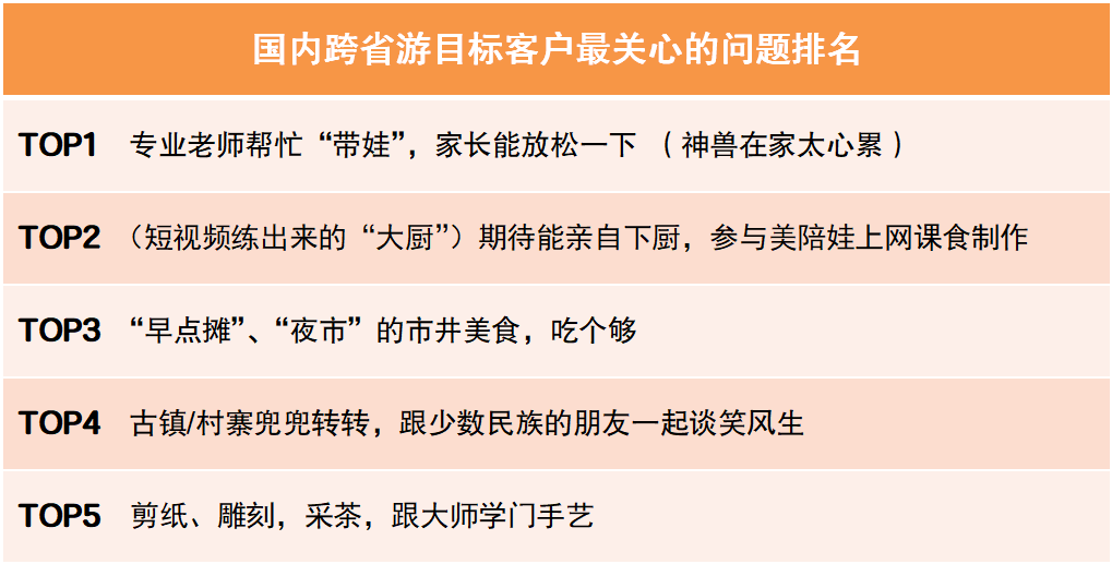 通過針對(duì)中青旅遨游網(wǎng)會(huì)員、中青旅聯(lián)盟成員單位的忠實(shí)客戶等群體的調(diào)研,以及近半年中青旅遨游網(wǎng)搜索、瀏覽的監(jiān)測(cè)數(shù)據(jù)進(jìn)行綜合分析。結(jié)果顯示,西南和西北是客戶喜好程度最高的兩大地域;云南、江蘇、新疆、三亞、陜西是客戶喜好程度最高的五大熱門目的地。客戶最關(guān)心的問題,帶娃、參與、美食、閑逛、學(xué)藝則位列前五名。