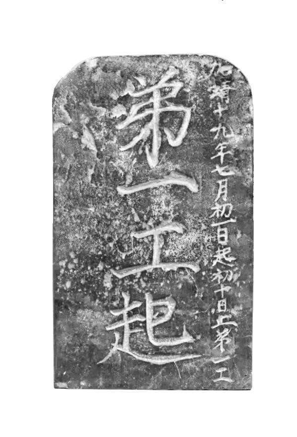 這塊“長城工牌”,高19厘米,寬11.5厘米,厚2厘米。兩面陰刻楷書,共58字,正面豎刻兩行字,共22字,正中刻“弟一工起”四個大字,右邊刻“加靖十九年七月初一日起初十日止第一工”一行小字;背面文字分上下兩部分,共36字。上部刻四個大字“蔡止梅起”。下部豎刻六行32個小字“一工李清隊(duì)起,二工梅喜隊(duì),三工王元隊(duì),四工侯勛隊(duì),五工位宗隊(duì),六工張曇隊(duì)止”。