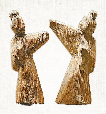 武威磨嘴子漢墓出土,現(xiàn)藏甘肅省博物館的兩件彩繪木舞蹈俑,其中一件寬4.9厘米,厚3.5厘米,高26.7厘米。木俑梳高髻,著長袍,身體向右傾斜,左臂置于胸前,右臂舉起,頭微側,作舞蹈狀。另一件木俑底寬5.4厘米,高14.5厘米,削制而成。以黑、紅兩色繪五官和衣領等。木俑挽高髻,穿袍服。左臂撫胸,右臂向前上舉起,身子傾斜,作舞蹈狀。它們和同一地點出土的漆樽舞蹈畫一樣,都是現(xiàn)實生活中官僚貴族富戶舞伎的藝術再現(xiàn)。
