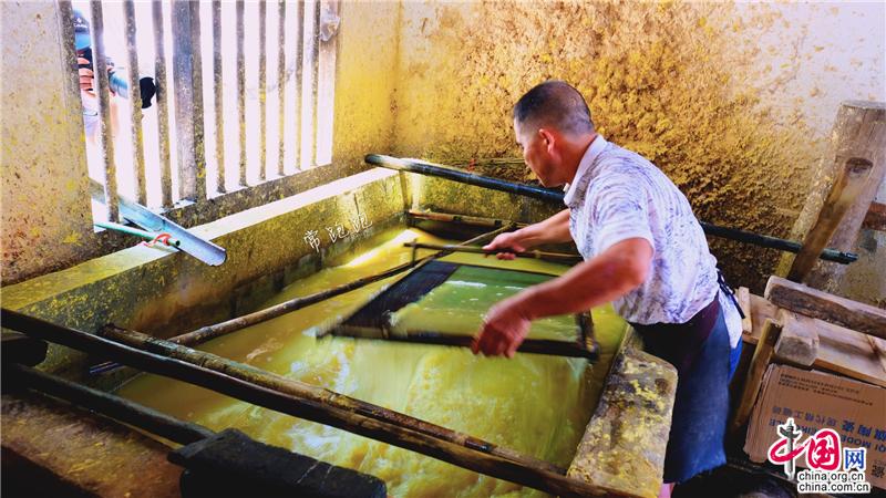 隆回縣灘頭鎮(zhèn)桃林村手工抄紙作坊,已經(jīng)成為一處著名的文旅項目景點。走進陶林村,一棟棟青瓦石墻的新屋吸引了人們的目光。屋外山坡竹林茂密,山溪流水潺潺,屋內(nèi)手工抄紙制作的原料、工具布置的次序井然,手工抄紙的全套工藝流程在這幾棟屋中得以完整體現(xiàn)。手工抄紙技術(shù)歷史悠久,始于隋唐,至明朝時抄紙已經(jīng)非常盛行。上世紀(jì)八十年代鼎盛時還曾遠銷東南亞和日本。非遺傳承人李志軍今年61歲,自稱“紙蟲”,帶領(lǐng)著全家人承襲著祖宗留下的獨特技藝。而支撐著李志軍的堅守的,是隆回縣文旅部門的巨大付出和努力。2011年,他們支持李志軍建立了手工抄紙標(biāo)準(zhǔn)化作坊,2016年又對該作坊進行擴建,使之成為國家級非遺項目。灘頭手工抄紙作坊占地面積1714平方米,是灘頭手工抄紙有史以來最大的作坊,同時也是集生產(chǎn)、創(chuàng)新、傳承、展示、研學(xué)為一體的重要基地和文旅基地。