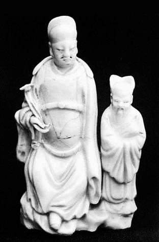 這件白瓷供養(yǎng)人像,為德化瓷人物像,釉面為純白色,色澤光潤(rùn)明亮。整件雕塑由兩個(gè)人物構(gòu)成,一大一小,一主一副。主像高13.7厘米,身穿典型的明代服飾,人物端坐在山石上,衣著瀟灑,神態(tài)自然從容,盡顯雍容華貴,而手執(zhí)如意則似乎暗示著他內(nèi)心的向往和追求。整個(gè)構(gòu)圖自然放松,給人一種輕松的感覺。小人物則是長(zhǎng)髯飄灑,笑容和藹可親,似乎帶著點(diǎn)職業(yè)習(xí)慣的微笑,雖然年紀(jì)比較大,但卻處于仆從的位置,手里還抱著一卷書。從一個(gè)側(cè)面烘托出了年輕主人的身份。