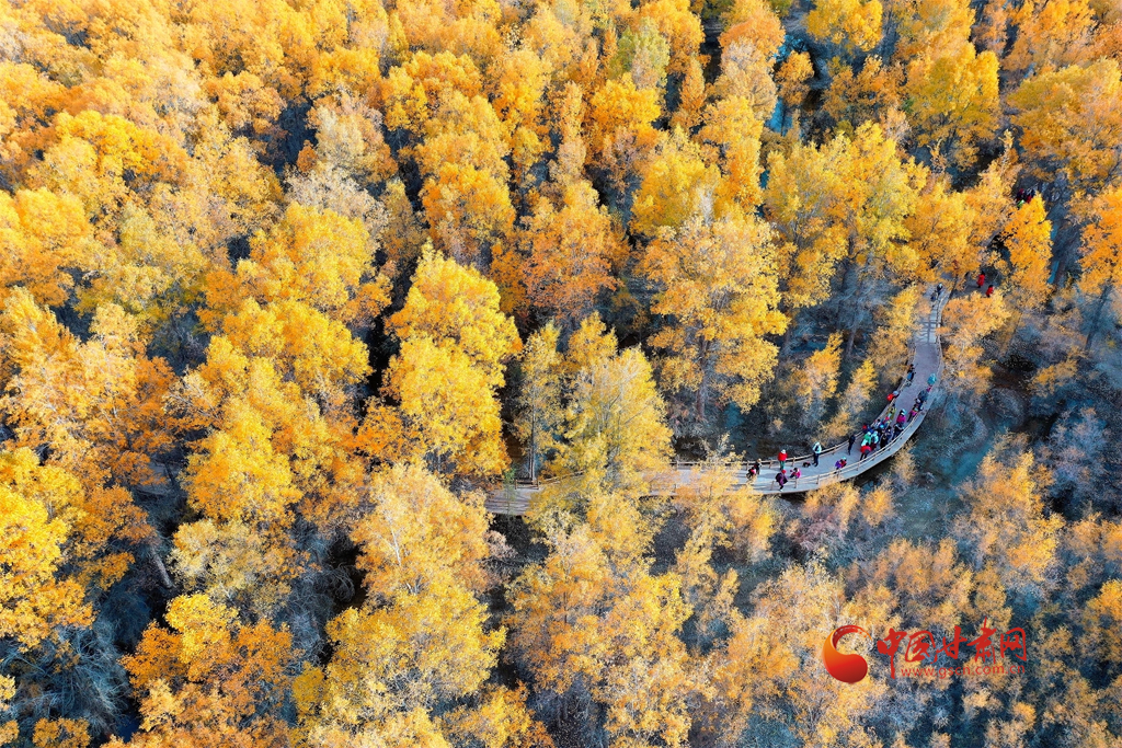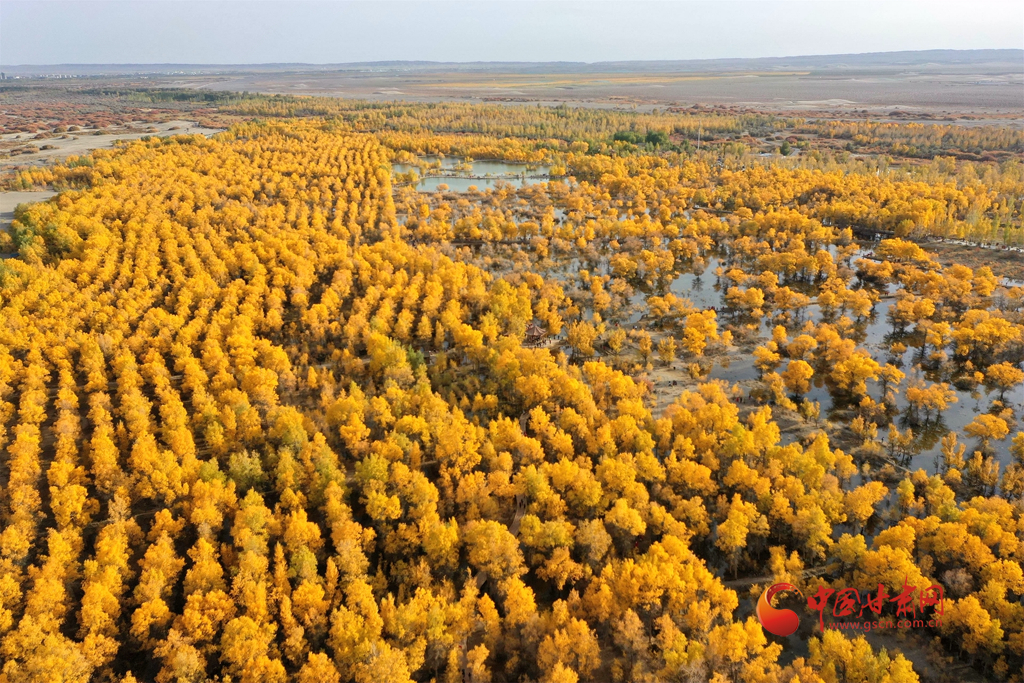 10月10日,在甘肅省酒泉市金塔沙漠胡楊林景區(qū),胡楊林在陽(yáng)光的照耀下金黃燦爛,與湖水相映,令人流連忘返。(無(wú)人機(jī)照片)