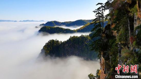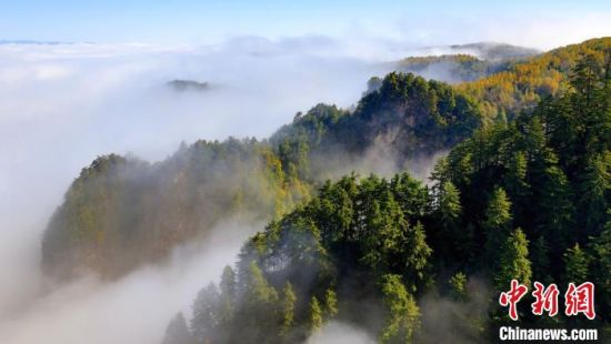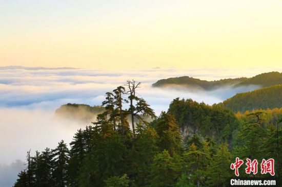 10月上旬,甘肅省定西市漳縣貴清山國家森林公園,朝陽在云層中若隱若現(xiàn),云遮霧繞的景象讓層巒疊嶂的山峰成為“云端村落”,仿若仙境。漳縣貴清山國家森林公園境內(nèi)原始森林遍布,森林、動(dòng)植物資源十分豐富,貴清山被譽(yù)為隴中的“小華山”,是生態(tài)旅游勝地。