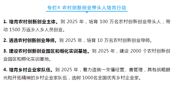 深入實施農(nóng)村創(chuàng)新創(chuàng)業(yè)帶頭人培育行動,加大扶持,培育一批扎根鄉(xiāng)村、服務農(nóng)業(yè)、帶動農(nóng)民的創(chuàng)新創(chuàng)業(yè)群體。