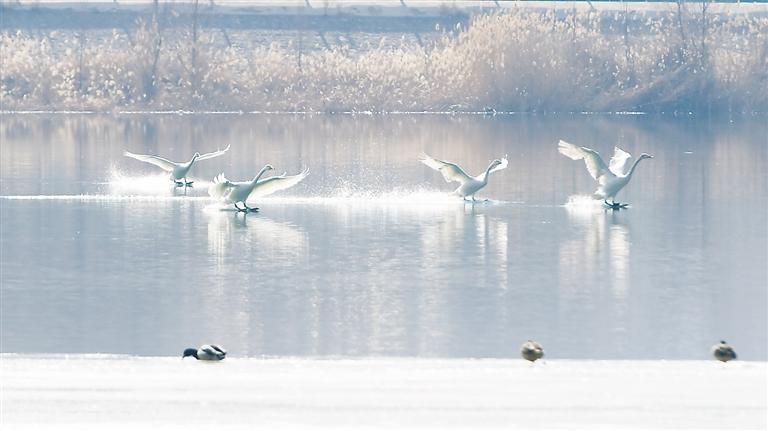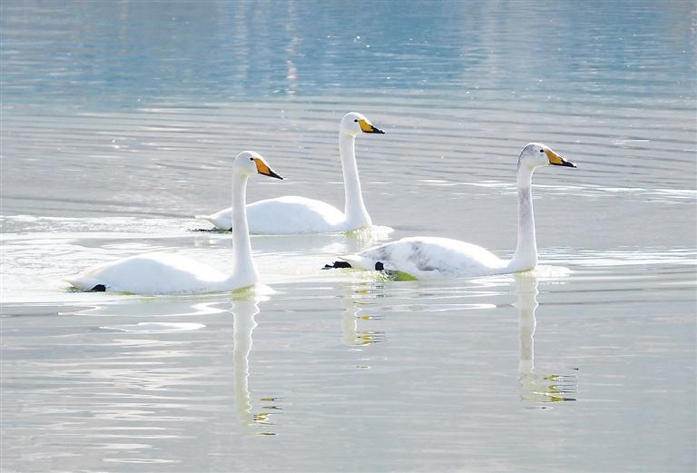 近日,永靖縣鹽鍋峽鎮(zhèn)境內(nèi)的黃河八盤峽水庫成為天鵝等候鳥越冬的樂園,它們?cè)诖藯ⅰ⒁捠?,成為冬日黃河里的一道靚麗風(fēng)景。 本報(bào)記者 史有東 攝