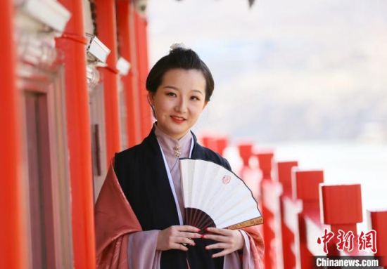 圖為蘭州青年身穿漢服在百年梨園賞景。 高展 攝
