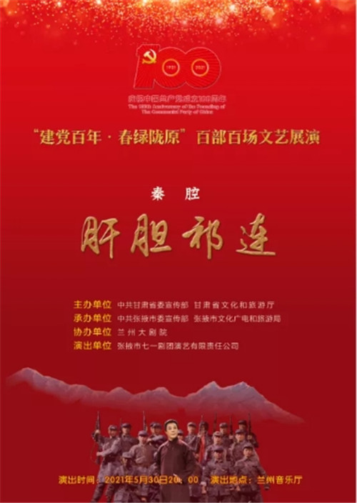 中國甘肅網(wǎng)5月28日訊(本網(wǎng)記者 宋芳科)5月30日晚,剛剛斬獲第六屆甘肅戲劇紅梅獎大賽“紅梅劇目獎”第一名的好成績的秦腔戲《肝膽祁連》,將在蘭州音樂廳精彩上演。《肝膽祁連》以真實(shí)的歷史故事改編,講述了民主人士高金城營救紅西路軍戰(zhàn)士的感人故事。屆時,中國甘肅網(wǎng)將現(xiàn)場直播,歡迎廣大網(wǎng)友點(diǎn)擊進(jìn)入直播間,重溫一段波瀾壯闊而又感人至深的歷史,一起向祁連英魂高金城致敬。