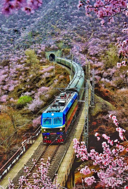 央廣網(wǎng)蘭州4月2日消息 (記者 邸文炯 通訊員 王紅剛 孫淑霞)近日,甘肅省崇信縣峽門寶中鐵路華亭市安口窯站附近的山上桃花盛開,花香四溢、如煙似霞?;疖噺纳街械乃淼来┬卸^,駛向一片春光燦爛。