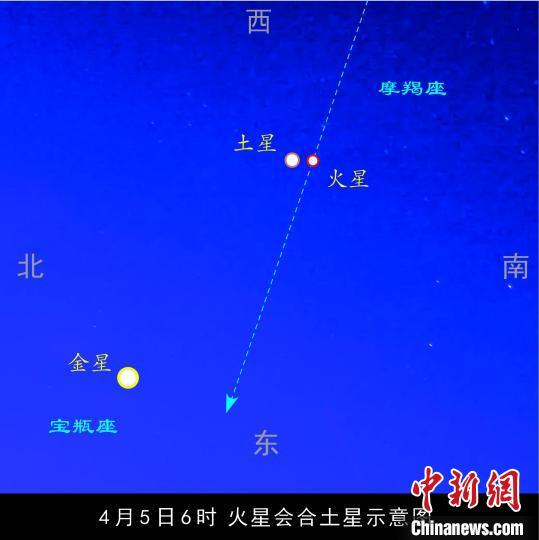 據(jù)廣州市五羊天象館1日透露:今年4月5日,將出現(xiàn)火星會(huì)合土星的天象奇觀,奇在二者相距很近,“擦肩而過”的距離之短,為44年來之冠。如果天色晴朗,不僅中國(guó)各地可看到,而且?guī)缀跏澜绺鞯兀ū睒O地區(qū)除外)都可看到。