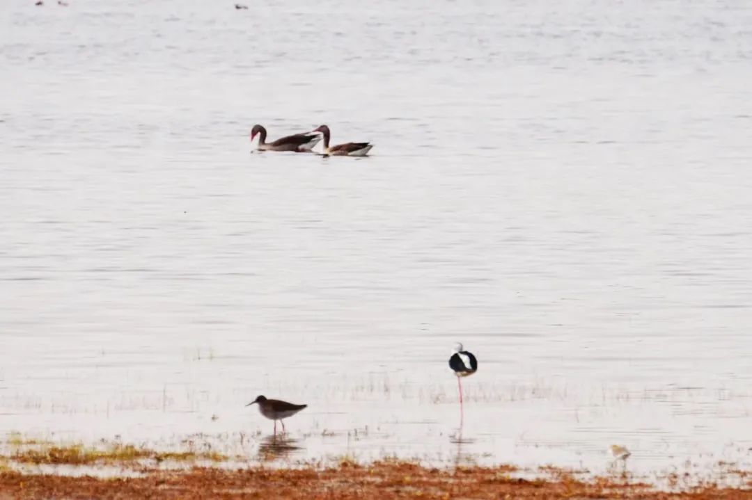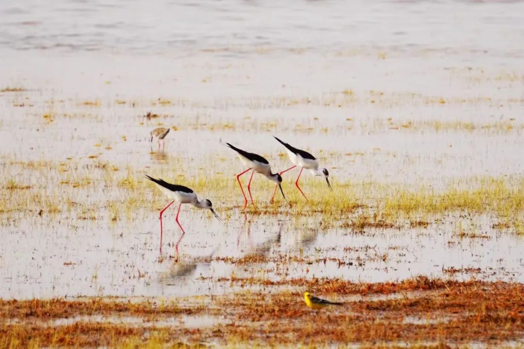 四月的敦煌大地春和景明,在庫姆塔格沙漠的邊緣,位于陽關濕地的壽昌海子波平如鏡,碧水映襯著祁連山上的雪峰,各種色彩斑斕地鳥兒仿佛收到了春天的邀約,在這里參加一場盛大的聚會。它們有的在湖面上引頸入水自在覓食,有的踏波翩翩起舞,有的追逐嬉戲鳴唱,有的在岸邊閑庭信步、悠然自得地曬太陽......構成了一幅多姿多彩的和諧自然生態(tài)畫卷。