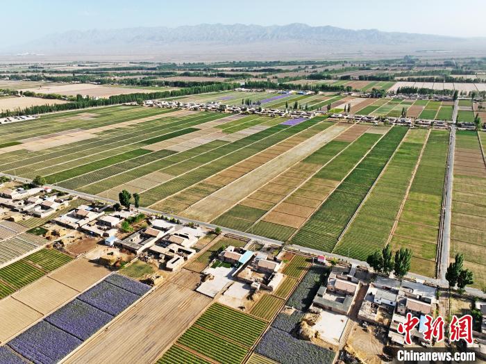夏日時節(jié),甘肅省張掖市高臺縣駱駝城鎮(zhèn)紅新村和梧桐村的田野間,農(nóng)舍青青、遍野吐翠,阡陌縱橫間五彩斑斕,構(gòu)成一幅美麗的田園風(fēng)光畫。