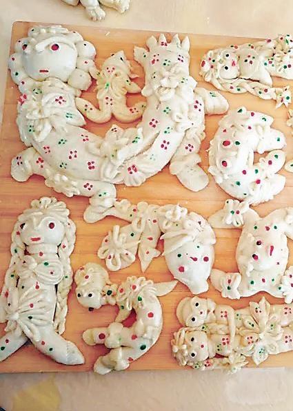 靜寧人的花饃饃,正是應(yīng)和了消病消災(zāi)、祈求平安的民間心理。端午禮儀中的面塑,表達著人們對美好事物的向往和祈禱。雖然是以食物的面目出現(xiàn),但那些充滿靈性的造型,卻飽含著人文的意蘊。靜寧人塑成動物的面花中,最多的是蟾蜍和蛇。蛇面花多是盤成一團的,沒有攻擊性又溫和的樣子。蟾蜍面花本地人叫“癩呱子”,形象很可愛,多的是兩只后足弧形對稱,蜷在腹部兩側(cè);兩只前足在頭頂相合,呈環(huán)抱姿態(tài)。也有別出心裁的婦女,會做出十二生肖之類的面花,這些面花,修飾并不夸張,其神韻更勝于外在的精致技巧。所有的端午面花都寄寓著大人們的祈福,但孩子們最喜歡的是動物面花,古靈精怪的,讓他們舍不得摸,更舍不得吃,只能與荷包一起掛在胸前賞玩,或與鄰家的小孩子一起比,看誰的媽媽手更靈更巧。