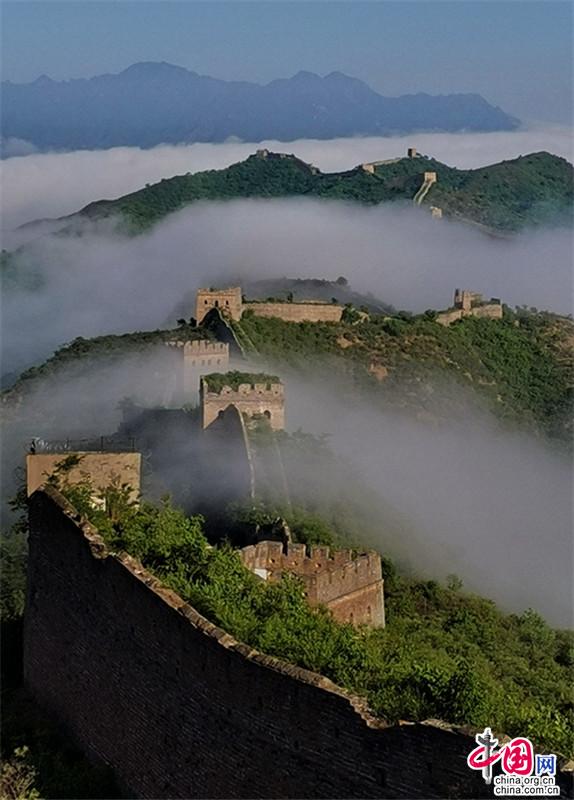 升騰的云霧中,蜿蜒的長(zhǎng)城像巨龍盤(pán)踞在云海之中,氣勢(shì)磅礴,尤為壯觀。