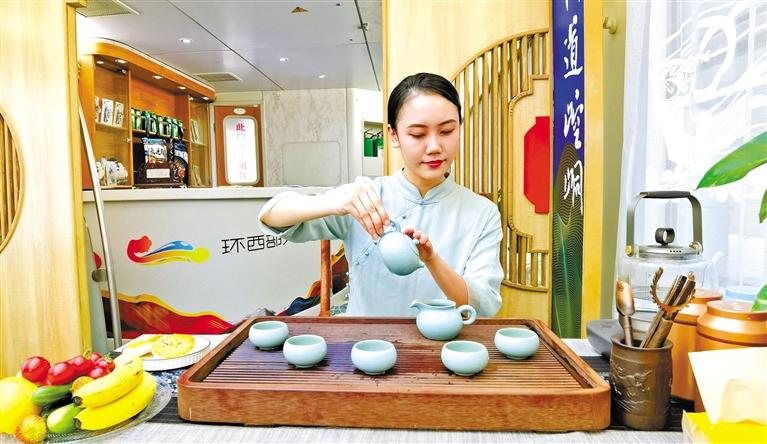 這趟列車由6節(jié)軟臥車廂、1節(jié)餐車、1節(jié)休閑娛樂(lè)功能車組成,車體內(nèi)外隨處可見(jiàn)平?jīng)鑫幕糜卧?。記者在車廂?nèi)看到,崇信龍泉寺、華亭安口窯古村落、靜寧仙人峽……每一間軟臥門上都是絕美的平?jīng)鲲L(fēng)光大片,整個(gè)車體儼然移動(dòng)的“平?jīng)鑫穆谜桂^”,讓人“身未動(dòng),心已遠(yuǎn)”。車體中部的功能車,更是顛覆了以往人們對(duì)火車的認(rèn)知,麻將桌、功夫茶、全套的K歌設(shè)備,還有平?jīng)鎏厣穆蒙唐?、農(nóng)特產(chǎn)品展銷區(qū),平?jīng)鑫穆脮?shū)刊閱覽區(qū)、平?jīng)鑫幕黝}報(bào)刊欄,足以打發(fā)游客在旅途中的無(wú)聊時(shí)光。餐車也極富特色,車廂頂部裝飾有色彩豐富的藻井圖案,飛天仙子衣袂飄飄、環(huán)繞四周。“在這樣的餐車上吃飯,吃的那是品位。”一位乘客開(kāi)心地和同行的伙伴說(shuō)著。62歲的張女士一到平?jīng)鼍兔Σ坏亟o女兒發(fā)微信,“火車上住得舒適,服務(wù)好,環(huán)西部火車游·崆峒號(hào)很超值!”